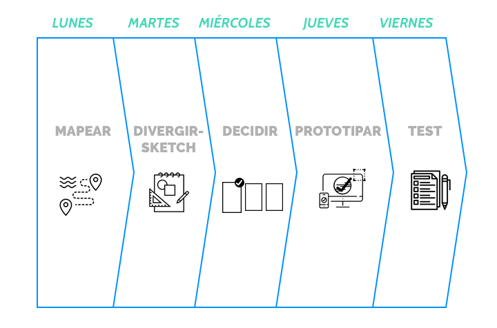 La promesa (y, por tanto, el objetivo) es crear una experiencia de diseño en 5 días, bien adoptando una trayectoria de usuario ya existente o bien partiendo desde cero, pudiendo hacer frente así a los problemas de Producto que surjan, en tiempo récord y con un coste reducido.
