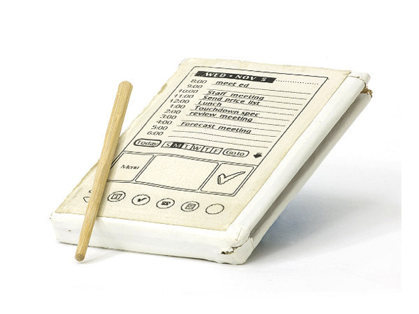- Qualitatifs - Les clients donnent leur ressenti sur un concept prototypé grossièrement (ce type de prototype est appelé par les designers « lo-fi » pour low-fidelity). Le prototype peut prendre la forme de maquettes d’interfaces réalisées avec des outils de prototypage tels que Axure et Basalmiq ou d’objet physique lorsque le produit s’y prête. C’est, par exemple, ce qu’a réalisé Jeff Hawkins en prototypant sur un morceau de bois ce qui allait devenir le premier PDA (Personal Digital Assistant) Palm Pilot :