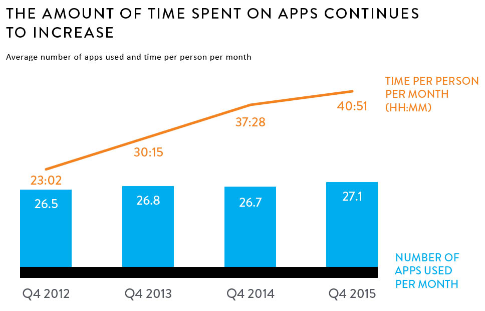 L’évolution de l’usage dans le temps montre bien une compétition de plus en plus forte entre les apps pour obtenir l’attention de l’utilisateur : en moyenne, en dépit de l'augmentation du temps passé sur les smartphones, le nombre d'app utilisé par chaque utilisateur reste globalement stable (note : les statistiques ci-dessous concernent les USA).