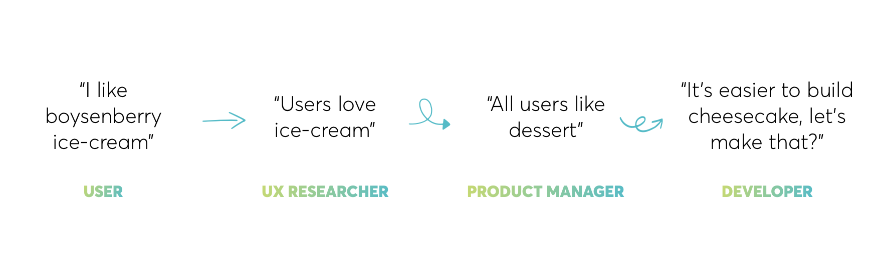 Le problème évident ici c’est que la recherche est la plus performante lorsqu’elle est à jour et pertinente. La recherche utilisateur n’est bénéfique que si elle aboutit à d’excellentes expériences client. Plus les idées émanant de la recherche sont éloignées des usages réels, moins elles auront d’impact.