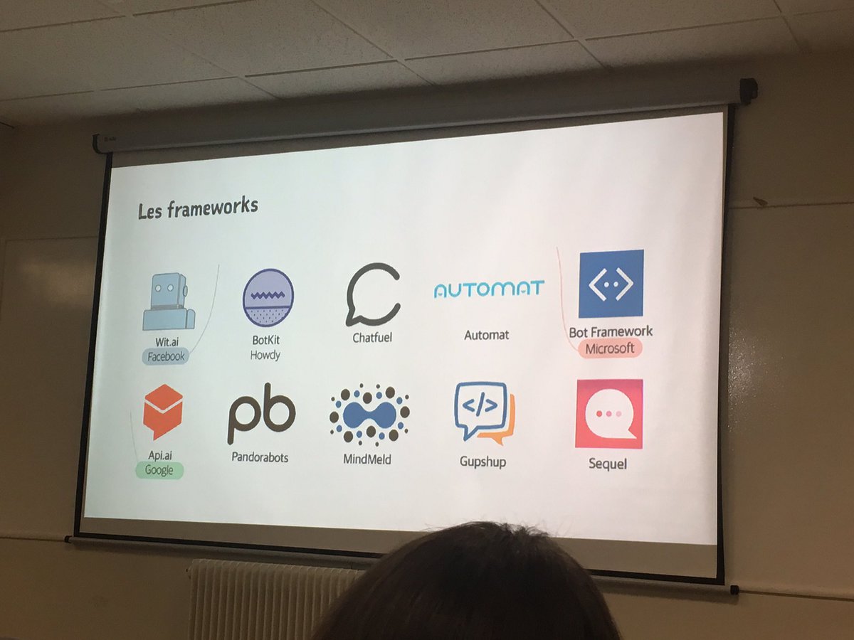 Enfin, Benjamin nous a proposé un panorama du pays merveilleux des Chatbot ; assez sceptique sur cette nouvelle "mode", j'en suis ressorti assez impressionné par le nombre de plate-formes permettant de créer et d’entraîner son chatbot à moindre coût (Wit.ai développé par Facebook, API.Ai récemment racheté par Google...)