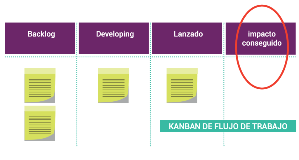 Si trabajas con Kanban, una manera de evitar que te olvides seguir la evolución de una feature tras su lanzamiento satisfactorio es incluir una columna de «impacto conseguido». Si estás trabajando con Scrum, ten siempre a mano una lista de features lanzadas recientemente en una pizarra de software dedicada o de gestión visual.