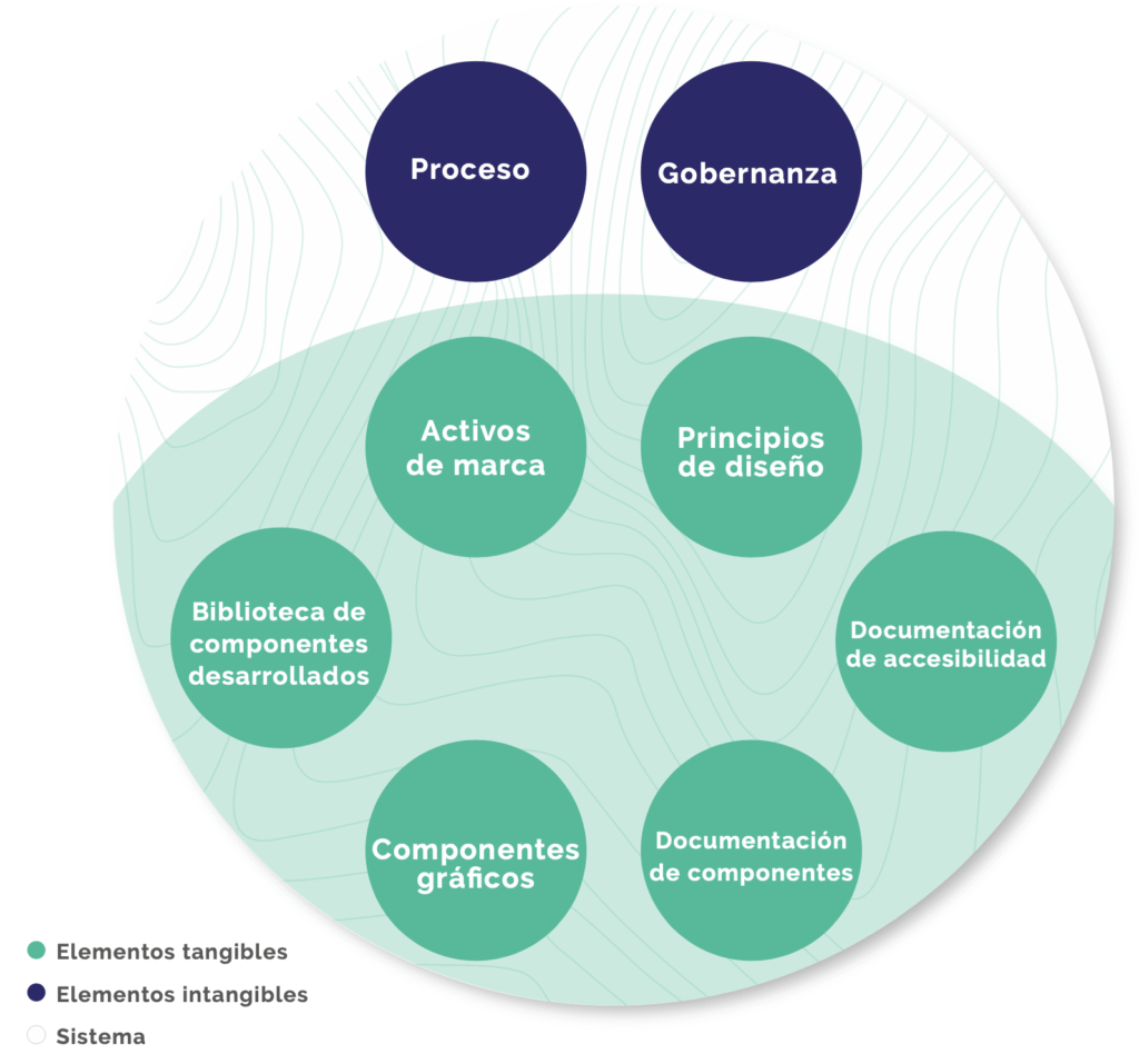 Un Design System es un sistema basado en elementos tangibles, como el contenido, y en elementos intangibles, como los procesos (Teresa Mira, «7 requisitos de un Design System holístico», Medium). Esto es todo lo que puede implicar: