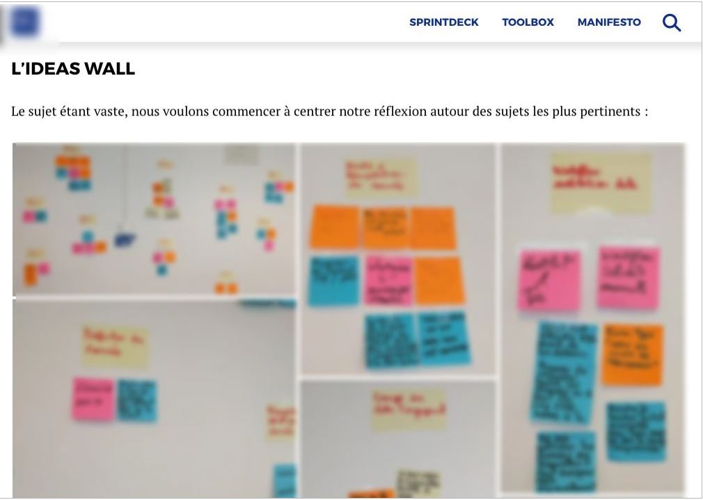 - Créer un outil de communication (blog) : une fois un sprint terminé, nous rédigeons désormais un article présentant les différentes phases du sprint, les conclusions de chaque atelier, les différents livrables et recommandations de l’équipe, le tout sous forme d’un blog accessible aux participants et collaborateurs du groupe.