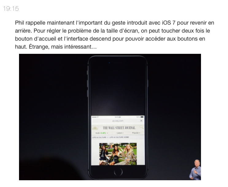 Quelle solution propose Apple pour compenser la taille de l'iPhone 6 et le "problème" de la logique de navigation iOS ? Une révision complète d'iOS ? Pas du tout : une manipulation pour faire baisser l'écran. Chacun jugera du caractère innovant ou de l'élégance relative de l'approche.