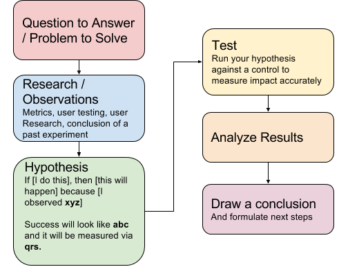 - Créez vos recettes. Considérez ces dernières comme le nouveau format de vos fiches de spécifications. Avec un pipeline, vous saurez pratiquement toujours quels seront les 1 ou 2 prochaines fonctionnalités à implémenter. Commencer à construire votre plan de test à l'aide de la méthode scientifique énoncée plus tôt. (Pour rappel : Observations, hypothèses, métriques de succès, variations, résultats, conclusions, prochaines étapes). Tout cela vous forcera à adopter une approche "data-driven".